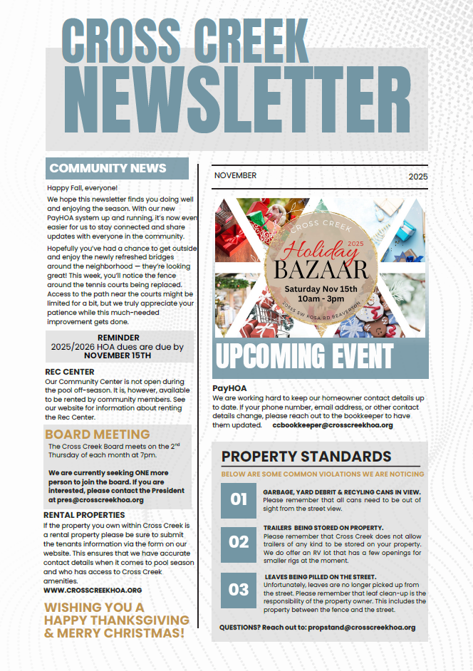 MONTHLY HOA MEETINGS: Meetings are in-person at the Rec Center on the 2nd Thursday of every month at 7:00pm. We hope to see you there!